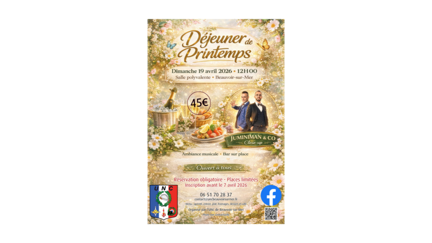 Un déjeuner de printemps est organisé par l'UNC Beauvoir-sur-Mer, le dimanche 19 avril 2026 à 12h00.Ce sera à la salle polyvalente.