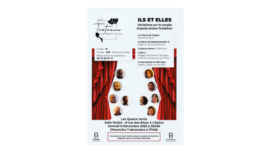 Les TRETAUX NOIRMOUTRINS reviennent sur scène pour le spectacle Ils et Elles avec des adaptations des textes d'Anton Tcheknov : le chant du cygne, la jeune veuve et autres variations sur le couple.