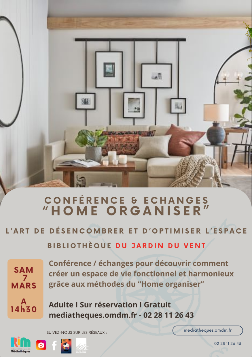 Une info de la médiathèque du Jardin du Vent, à Notre-Dame-de-Monts. Elle accueille une conférence / échanges : « Home organiser – Et si on allégeait son intérieur… et son esprit ? »