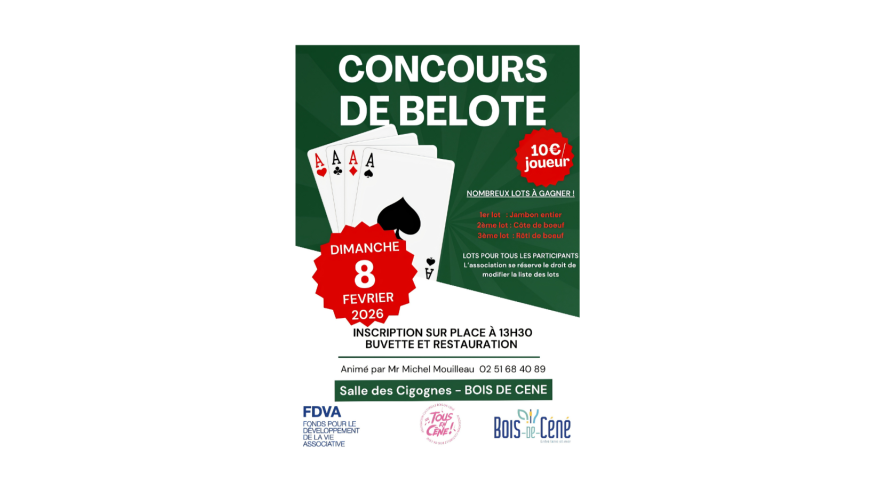 L'association Tous en Cène, organise pour la 2ème fois, un concours de belote le dimanche 8 février - salle des cigognes à Bois-de-Céné.