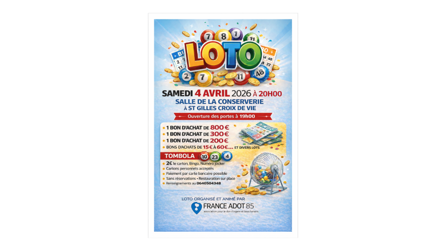 L'association France ADOT 85 (Association pour le Don d'Organes et de Tissus Humains) organise un loto, le samedi 4 avril à 20h.