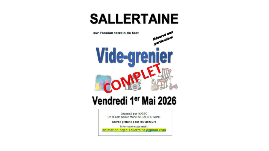 Le vendredi 1er mai, vous avez un vide-grenier organisé par l'OGEC de l'école Sainte Marie de Sallertaine.
