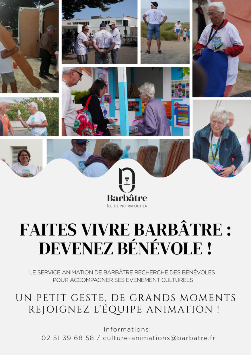 Le service culturel de la Mairie de Barbâtre communique. Il recherche des bénévoles pour contribuer à l’animation de la commune, d'avril à septembre, tout au long de la saison ou pour un événement ponctuel, rejoignez l’équipe et participez à des moments festifs uniques.