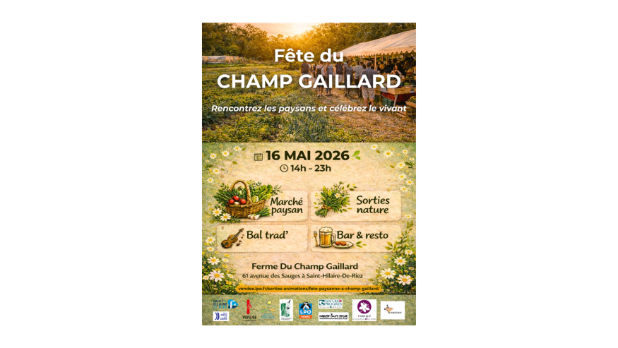La fête du Champ Gaillard, c'est le 16 mai de 14h à 23h. Le rendez-vous sera à la ferme du Champ Gaillard à Saint-Hilaire-de-Riez.