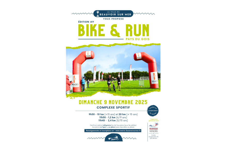 Le dimanche 9 novembre, venez en binôme au "Bike & Run du Pays de Gois". Dans votre équipe de deux : l'un est à vélo et l'autre à pied, vous pouvez vous échanger le vélo pendant la course. 4 épreuves sont prévues : infos et inscriptions sur www.mairie.beauvoirsurmer.fr L'évènement est organisé par la mairie de Beauvoir-sur-Mer et est en partenariat avec le Comité départemental du triathlon et le Comité d'organisation du vélo belvérin.