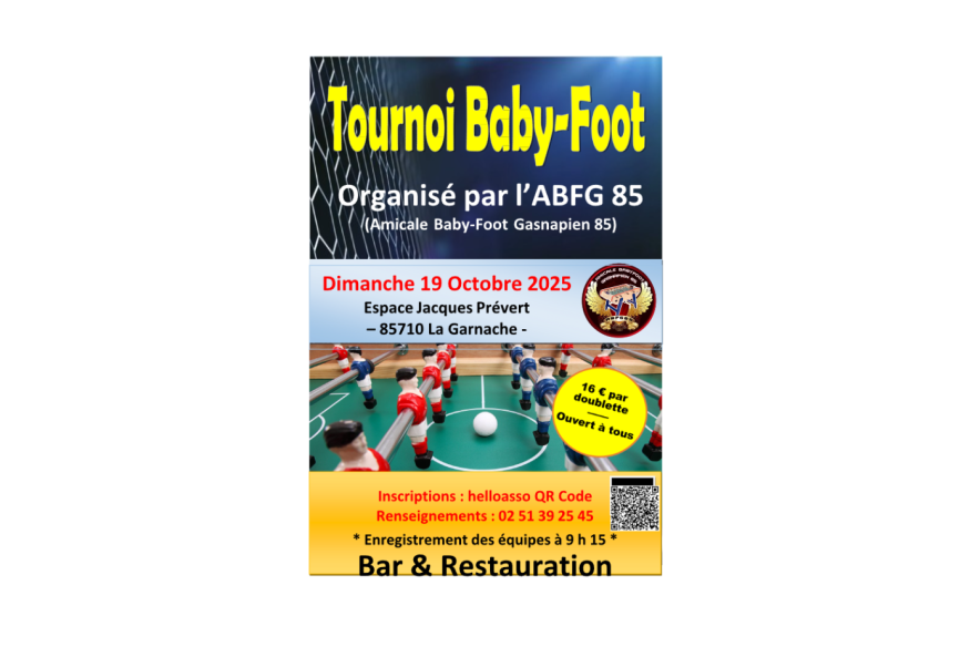 Rendez-vous le dimanche 19 octobre, à l'espace Jacques Prévert à La Garnache, pour un tournoi de Baby-foot. C'est au tarif de 16€ la doublette. Plus d'information au 02 51 39 25 45. L'évènement est organisé par l'ABFG 85.