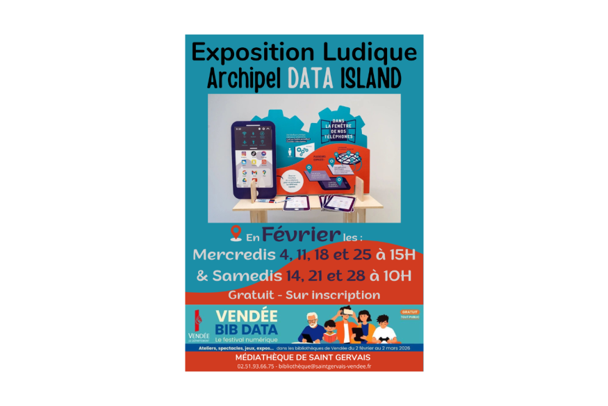 Pour cette 1ère édition du festival numérique "Vendée Bib Data", organisé par la Bibliothèque Départementale de Vendée, la médiathèque de Saint-Gervais vous propose l'exposition ludique Archipel Data Island : Les Mercredis 4, 11, 18 & 25 février à 15h Les Samedis 14, 21 & 28 février à 10h Gratuit- sur inscription, à partir de 12 ans. Un atelier pour mieux comprendre le fonctionnement des outils connectés et comment les entreprises du numérique utilise les données de leurs utilisateurs. L'exposition sera visible aux heures d'ouvertures....