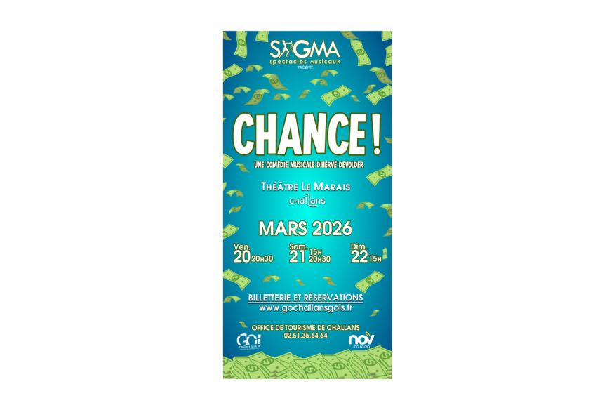 Nov est partenaire de ce super événement. Sigma (spectacles musicaux) présente la comédie musicale d'Hervé Devolder : Chance ! C'est au théâtre Le Marais à Challans, le vendredi 20 mars à 20h30, le samedi 21 mars à 15h et 20h30, et le dimanche 22 mars à 15h. Billetterie et réservations sur www.gochallansgois.fr Tarifs : 8€ pour les moins de 18 ans et 14€ pour le tarif plein. "Et si un ticket de loto transformait votre bureau en scène de folie ? Entre avocats déchaînés, stagiaire rêveuse et coursier Rock'N'Roll, venez découvrir ce cabinet pas comme......