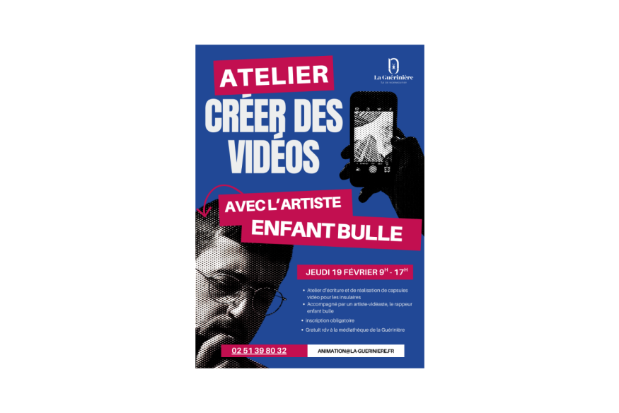 L’artiste Enfant Bulle, rappeur et vidéaste reconnu pour son travail mêlant écriture, image et création musicale, animera le jeudi 19 février, de 9h à 17h, un atelier gratuit intitulé « A Bé Chou Tour ! », à la médiathèque Au vent des mots. Ouvert à tous à partir de 10 ans, cet atelier propose une immersion dans un processus de création original autour de l’île de Noirmoutier : écrire ses propres textes, récits, souvenirs, poésie ou prose libre, puis lestransformer en capsules vidéo courtes, accompagnées par un artiste......