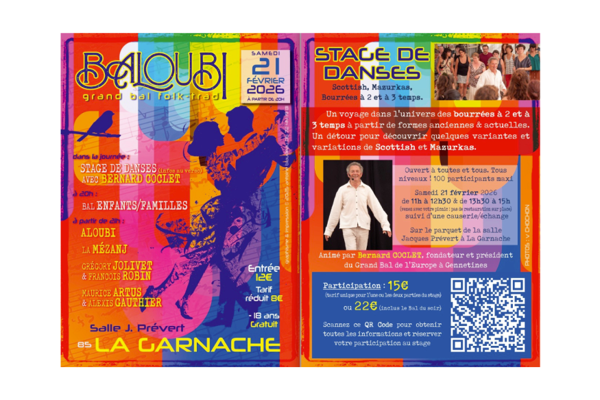 Une journée dansante, le samedi 21 février, avec un stage de Scottish et Mazurkas ainsi que des bourrées à 2 et à 3 temps. Suivi d'un bal d'enfants/familles à 20h et à partir de 21h c'est avec La Mézanj et Aloubi; Grégory Jolivet et François Robin, Maurice Artus et Alexis Gauthier. C'est à la salle Jacques Prévert à La Garnache.