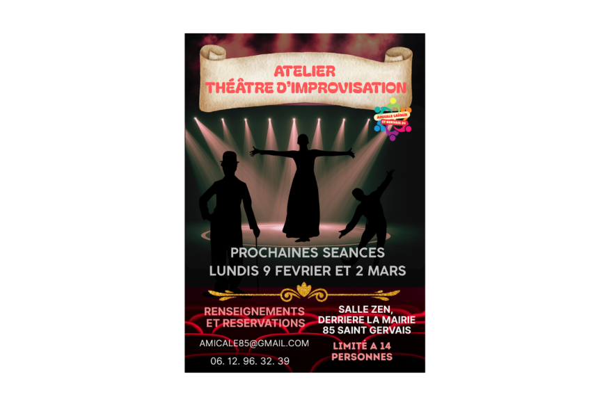 ASSOLUTION 85 organise à St Gervais, à la salle Zen (derrière la mairie), des ateliers d'improvisation théâtrale. Ce sera les lundis 9 février et 2 mars. Pour tous renseignements et pour réserver : amicale85@gmail.com ou au 06 12 96 32 39.