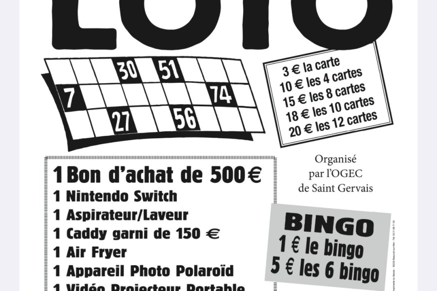 Jouez au loto, salle des Primevères, à Saint-Gervais, le dimanche 22 février. Ouverture des portes à 13h, jeu à 14h. Plein de lots à gagner et, en tête, un bon d’achat de 500 euros... Réservations possibles au 06 35 33 18 26....