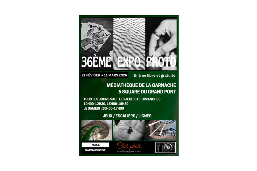 L'association Image Garnachoise organise son exposition annuelle le samedi 21 février. Le vernissage est à partir de 11h. Et c'est à la Médiathèque de La Garnache (6 square du Grand Pont). Les thèmes exposés seront : - photos argentiques : "JEUX " - photos numériques : "LIGNES" (en noir et blanc) - photos numériques : "ESCALIER" (en couleur)