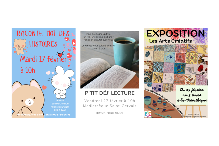Les animations prévues à la médiathèque de Saint-Gervais pour les semaines à venir : Exposition : L'Art Créatif - Du 14 février au 03 mars- Réalisée par l'Atelier créatif de l'Amicale Laïque ST Gervais, venez découvrir leurs créations : carte de vœux, dentelle de carton, pliage de livres, peintures, ..., visible aux heures d'ouverture. Exposition ludique Archipel Data Island - Mercredis 18, 25 & Samedis 14, 21 février - Un atelier pour mieux comprendre le fonctionnement des outils connectés et comment les entreprises du numérique utilise......