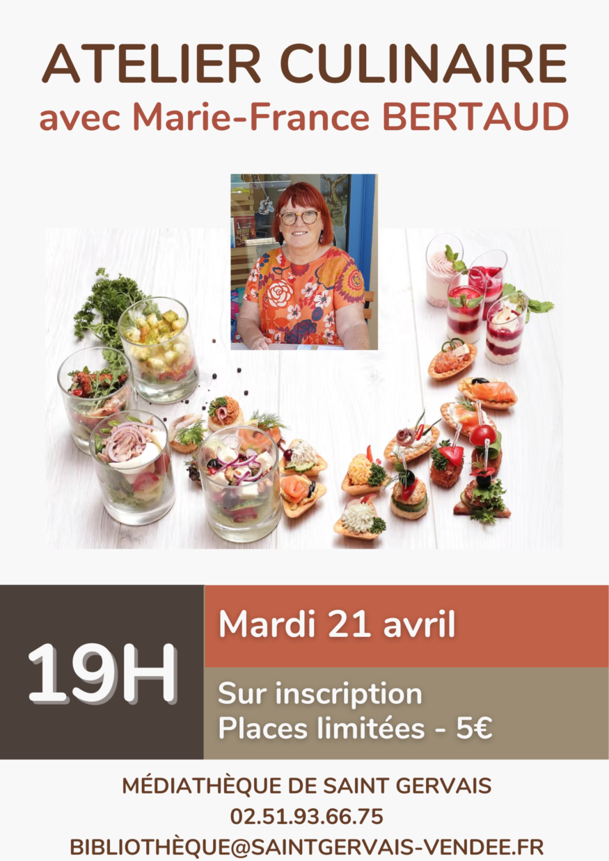 Une info de la Médiathèque de Saint-Gervais qui accueille de nouveau Marie-France Bertaud pour un atelier culinaire, le mardi 21 avril à 19h00. Bien connue en Vendée, Marie-France partage avec chaleur sa passion pour la cuisine, dans ce rendez-vous pour gourmets et gourmands. Tarif 5 euros, réservez votre place !