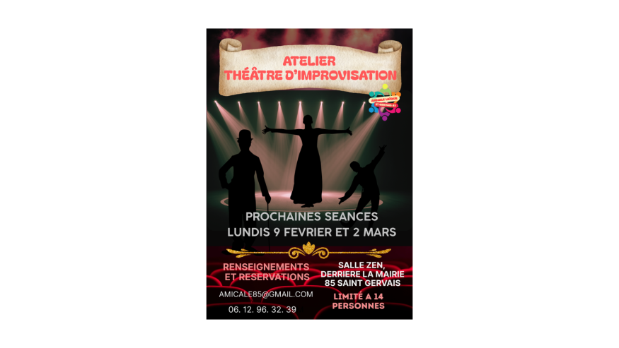 ASSOLUTION 85 organise à St Gervais, à la salle Zen (derrière la mairie), des ateliers d'improvisation théâtrale. Ce sera les lundis 9 février et 2 mars.