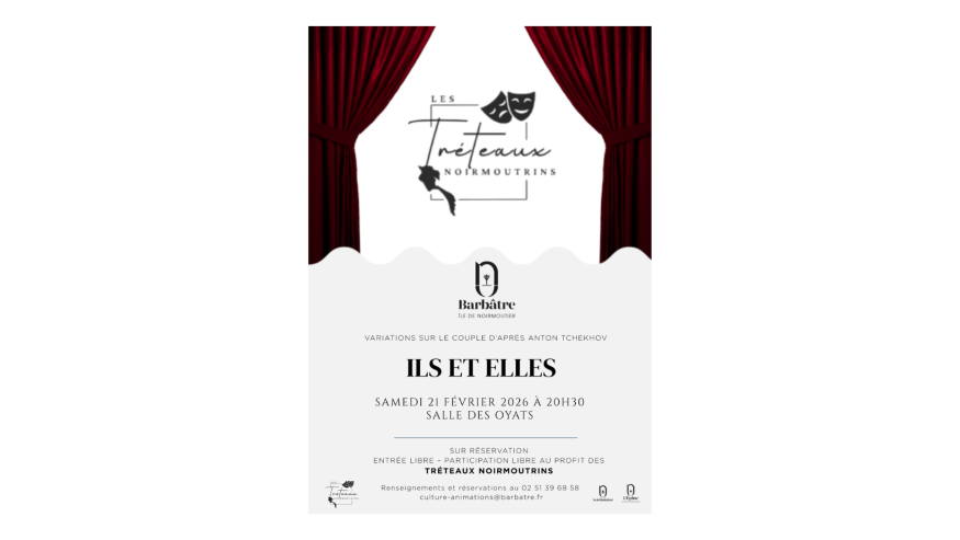 La Salle des Oyats à Barbâtre accueillera le samedi 21 février 2026 à 20h30 un spectacle théâtralconsacré à l’œuvre d’Anton Tchekhov.À travers une sélection de textes courts et incisifs, ce spectacle explore avec finesse, humour etprofondeur les relations humaines, les jeux de pouvoir, les désillusions et les élans amoureux. Uneplongée sensible et parfois grinçante dans l’univers intemporel de Tchekhov.Au programme (durée : 1h)- Le Chant du cygne- Le Récit de Mademoiselle K- La Jeune Veuve- L’Ours- La Demande en mariage