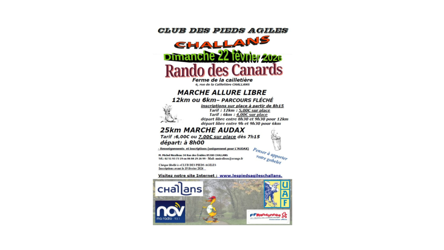 Le club des pieds agiles organise la Rando des Canards, le dimanche 22 février. Ce sera à la ferme de la cailletière.