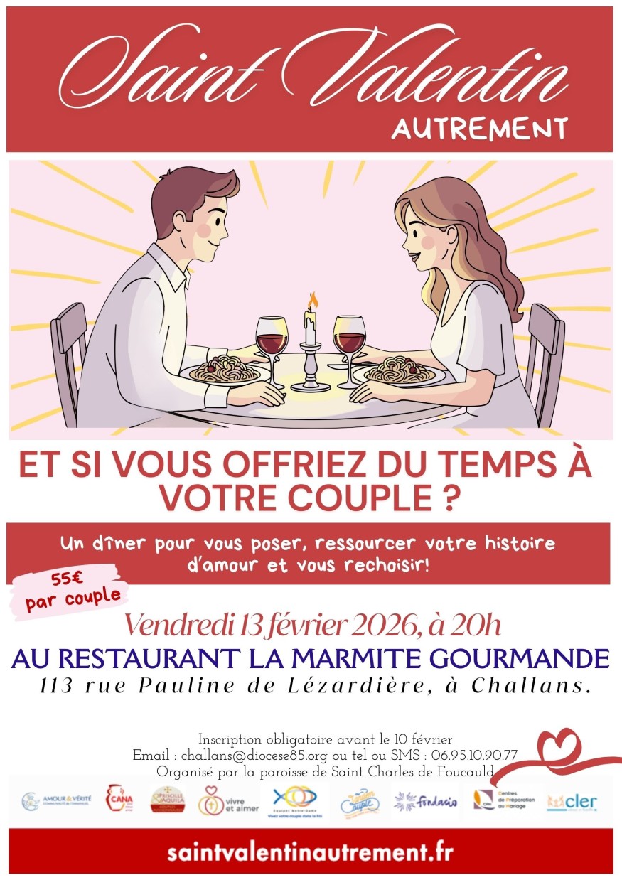 La Saint-Valentin approche ! Et qui dit Saint-Valentin, dit soirée en couple. Cela tombe bien, c’est ce qu’organise la paroisse Saint-Charles de Foucauld à Challans. Une « Saint-Valentin autrement. »