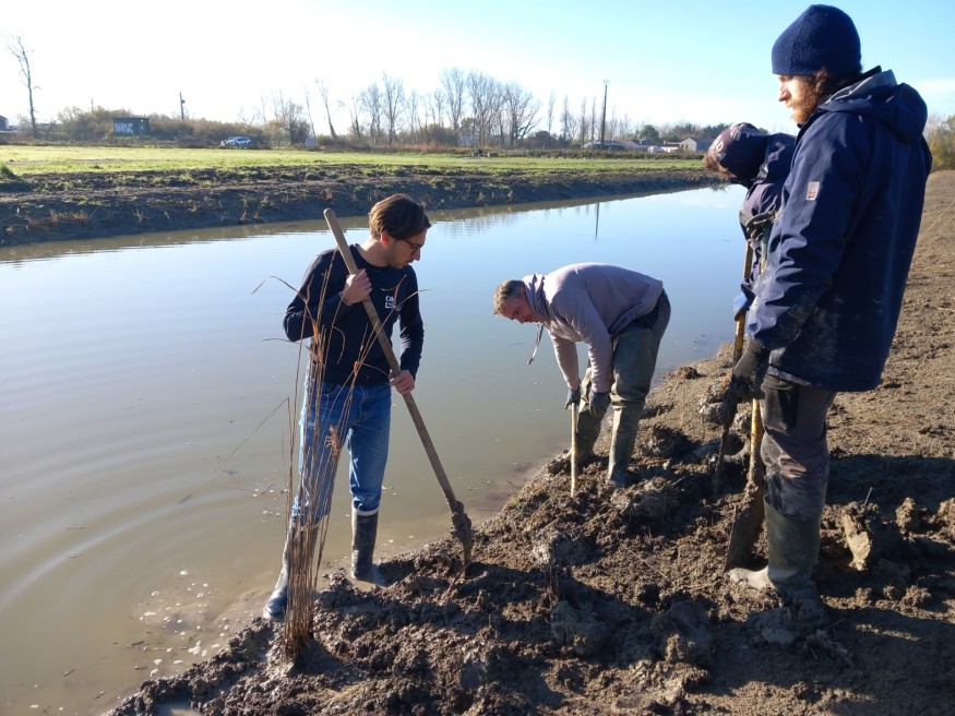 Pelle à la main, Maxime Fourrier, chargé de mission Environnement à OMDM, plante des roseaux avec une équipe d'ESNOV.